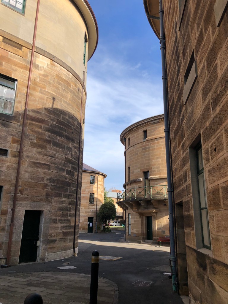 Wir saßen bei 23° Grad draußen und haben lecker gespeist. So gestärkt konnten wir uns in die nahegelegene Nationale Kunstschule aufmachen, um uns Bilder von Elisabeth Cummings anzuschauen, einer der bekanntesten Künster:innen Australiens. Die National Art School besteht aus einigen runden Türmen, die jeweils einem Thema gewidmet sind (Keramik, Bildhauerei, Malerei,…) und in denen die jeweiligen Werkstätten oder Ateliers untergebracht sind.