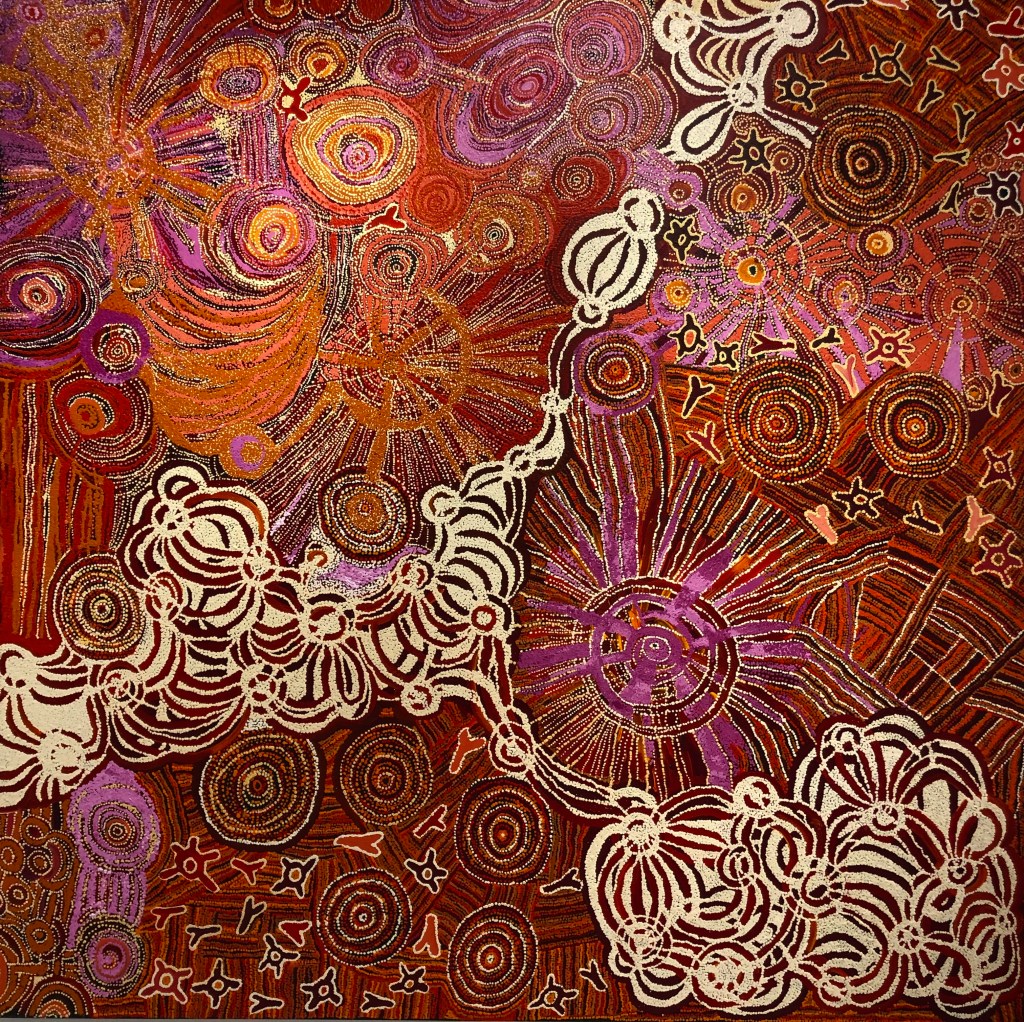 Von dort aus sind wir zu unserem nächsten Ziel spaziert und durch Zufall in einer kleinen Kunstgalerie gelandet, die von Künstler:innen der First Nations, also von Aborigines, geführt wird. Diese leben in der Mitte Australiens, in der Nähe von Alice Springs. Eine sehr nette Frau führt die Galerie in deren Vertretung und hat uns viel über deren Kunst und die Bilder erzählt.