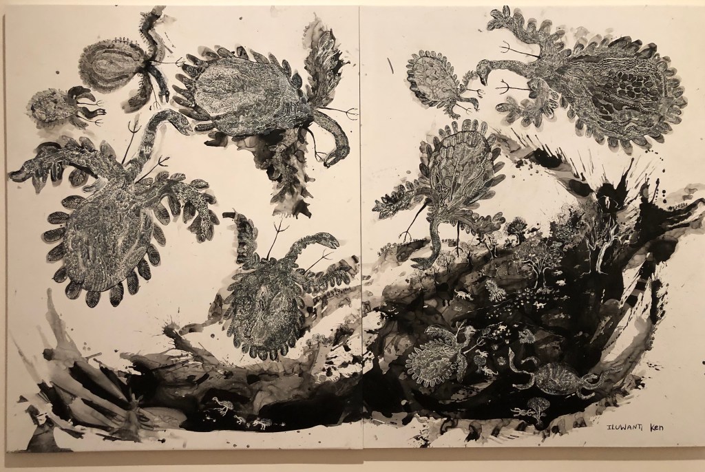 Dieses Bild erzählt die Geschichte von jagenden Adlern, die traditionell in Bezug zu Frauen stehen, ihrer Stärke, dem Jagen und Beschützen. Es gibt aber auch Werke zu sehen, die einfach nur Kunst sind und sich dem kulturellen Bezug verweigern, beispielsweise „Merman“ (das männliche Gegenüber zu einer Meerjungfrau).