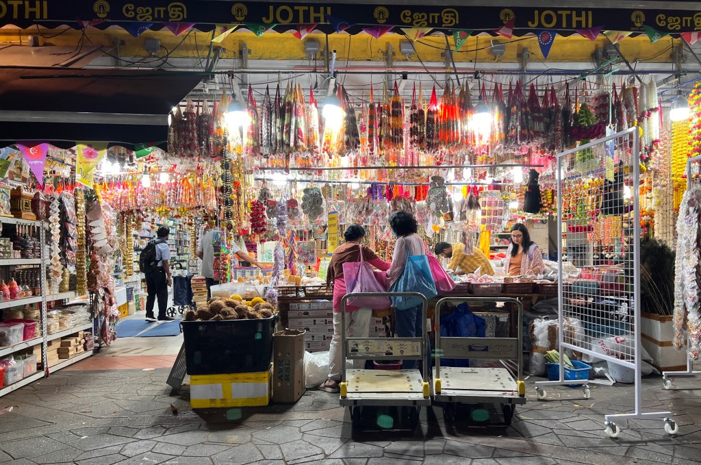 Einen Spaziergang haben wir nach Little India unternommen, das in den Abendstunden noch viel intensiver ist, als es schon am Tage war. Die Gerüche und vielen Restaurants, die Läden geöffnet und von Menschen durchströmt, Goldschmuck an allen Ecken und Blumenketten in allen Gößen, bunte Saris im Angebot, überbordende Eindrücke und Straßen voller Leben.